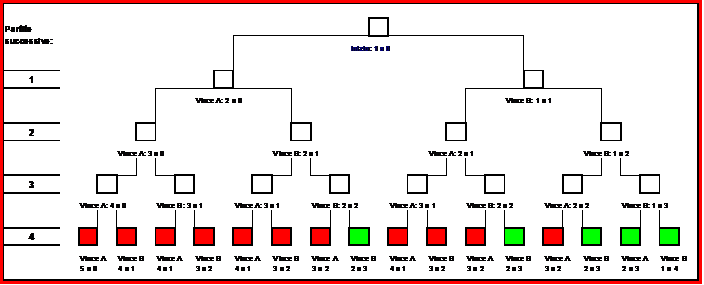 Dovremo immaginare che per ogni partita possa vincere tanto A quanto B e per ognuno di questi casi dovremo annotare il punteggio relativo via via raggiunto.