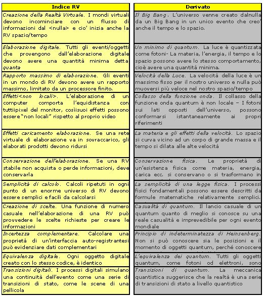 Brian, bwhitworth@acm.org , affronta l’idea che l’universo sia una realtà virtuale creata da “information processing” e trae spunto per ciò che i suoi commentatori bonariamente definiscono <this strange idea> dalle scoperte della fisica moderna circa il mondo fisico.Ovviamente il mondo potrebbe essere una simulazione operativa su uno schermo spazio temporale multidimensionale. Un se tira l’altro e se l’universo è informazioni, la materia, l’energia, il movimento ed altre cosette così potrebbero essere aspetti dell’informazione e le leggi della conservazione potrebbero essere ridotte ad un’unica legge della conservazione dell’informazione. Vedo i primi sorrisetti, ma calma e gesso! Dopo tutto la prima volta che un tale ha incominciato a tirar fuori che la Terra forse non era piatta e non stava sulle spalle di Atlante, ridevano tutti come matti. Perfino più tardi ai tempi di Colombo, quello venuto prima del celebre Tenente dall’occhio un po’ ballerino e dalla moglie virtuale, la cosa veniva ancora dibattuta dai saggi dell’Uni di Salamanca.