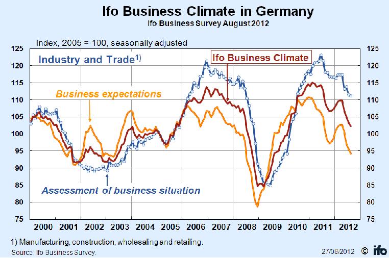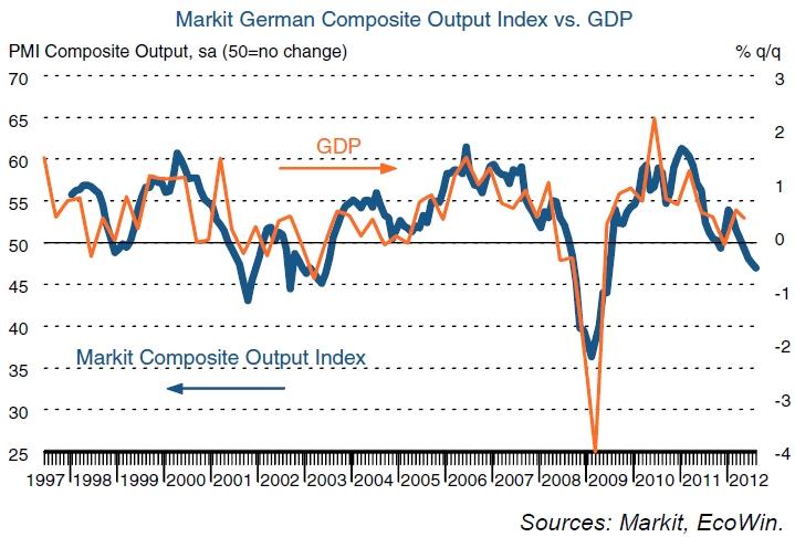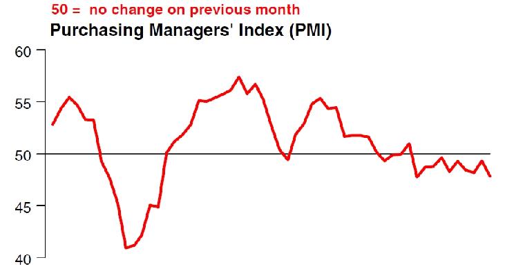 Germania, la Locomotiva d’Europa. Stanno sicuramente meglio di noi, anche se qualche birichino non molto tempo fa avesse avanzato l’idea, scrivendo rigorosamente in tedesco su stampa tedesca, che il sistema adottato per rilevare i dati del debito pubblico, nascondesse una bella fetta di guai. Ma bando ai pettegolezzi. Lo ZEW, l’IFO sono indici che misurano sentiment e status economico. E’ roba seria e soprattutto fatta da “loro”. Sono da un po’ negativi. Il PMI è un indice cui sono molto affezionato per la sua semplicità e per la rigorosità con cui Markit lo costruisce e aggiorna. Purchases Manager Index è un indice costruito interpellando i capi ufficio acquisti seguendo una logica di una coerenza ferrea. Se gli uffici acquisti non acquistano, marca male. Tanto per semplificare, ti dico che nella gradazione dell’Indice 50 è il break-even-point. Sopra siamo in espansione, sotto in recessione. Anche qui c’è poco da stare allegri.