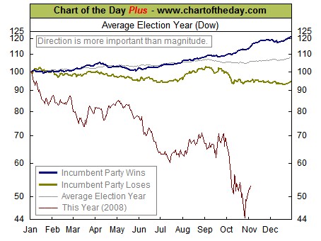 Il grafico in parola prende in considerazione una serie di medie relative agli anni di elezioni USA facendo dei raffronti con gli anni in cui il partito al potere esce dalle elezioni come deciso vincitore o sconfitto. Le statistiche, quelle che non mentono mai, dicono che “ … The stock market performed better than average in election years during which the incumbent party proved to be the ultimate winner …” Non è il nostro caso, esce Bush entra Obama al grido ‘Cambiamo Tutto!’.