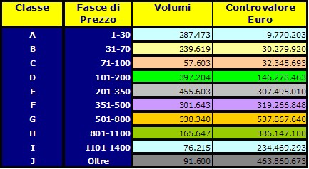 La tabella che segue non è classificata secondo ‘pesi’ lineari, ma per fasce di prezzo ponderate.