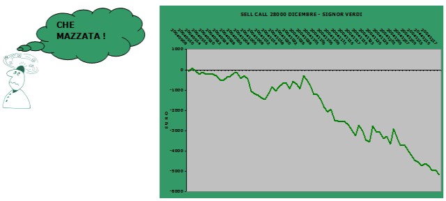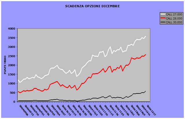 Il grafico che segue riporta giorno per giorno l’andamento delle tre Call in gioco: 27000, 28000 e 30000: