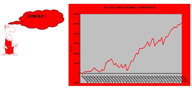 3. Bianchi decide di “ingabbiare il Sottostante” creando una Bull Call Spread: Long di 27000 e Short di 28000. Il costo sostenuto è veramente esiguo: 1180 punti spesi per la 27000 e 1105 punti incassati dalla vendita della 28000. Totale: (1180 – 1105) * 2,5 + 12 euro di commissione: 199,50 Euro. Con questa modesta spesa la “gabbia” è pronta: i 1000 punti di utile (2500,00 Euro) saranno tutti di Bianchi a patto che il Sottostante del 17 dicembre sia oltre 28000.