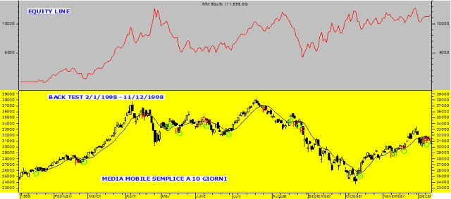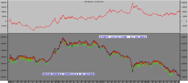 2)     La scelta del dominio 10 è stata del tutto arbitraria: visualizzando il grafico corrispondente, la MM10S si adattava molto bene (almeno otticamente) all’andamento del MIB30.