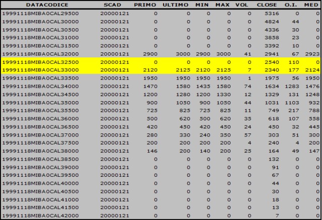 Dunque il 3 novembre 1999, sui circuiti IDEM, le Call gennaio 2000 strike 33000 avevano segnato questi prezzi: