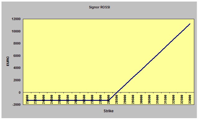 - Rossi compra la Call dicembre 28.000. Spende: 520 * 2,5 + 6 = 1306 euro