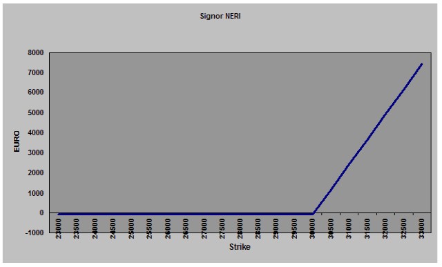 - Neri punta sulla Call dicembre 30.000. Spende molto meno: 50 * 2,5 + 6 = 131 euro.