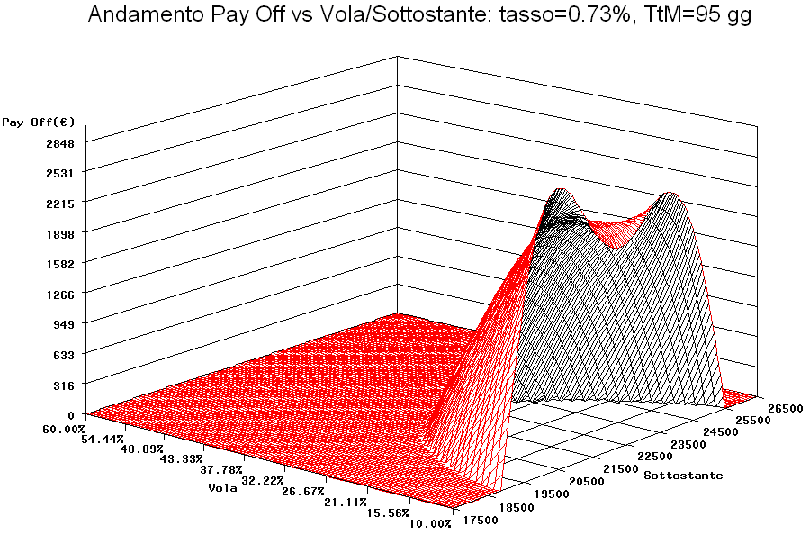 Cerchiamo di entrare più nel dettaglio: in analogia coi grafici riportati nel precedente intervento (“Pricing delle Opzioni 2^parte”)  la chart che segue mostra, solo per valori positivi, l’andamento del pay off (€) della struttura a 95 giorni (gregoriani) dalla scadenza (il tempo residuo tra il 14 giugno ed il 17 settembre 2010) in relazione al mutare della volatilità implicita e del sottostante.
