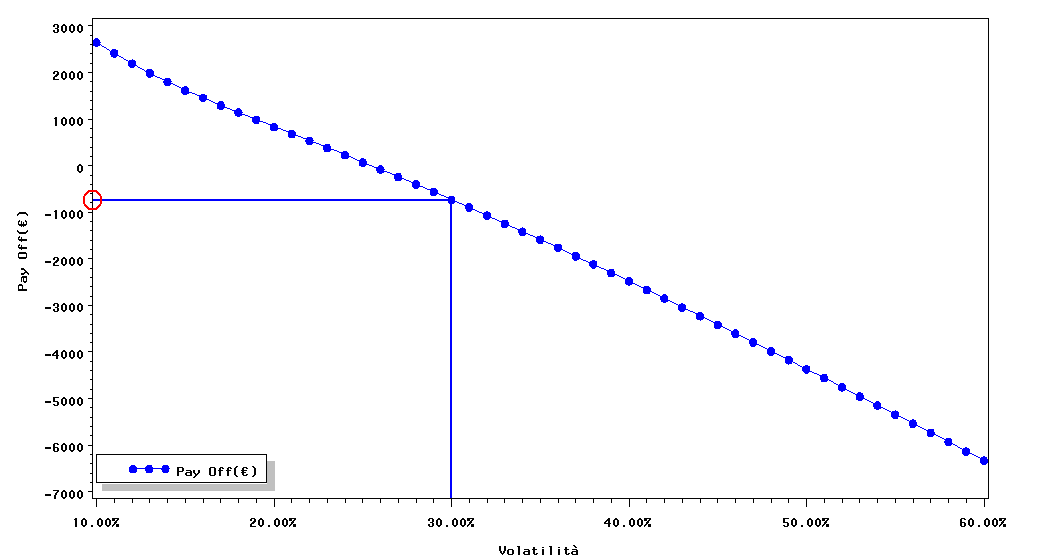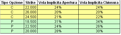 Da questo si può notare come ad una perdita di 740 euro che subiremmo in chiusura della struttura, corrisponda un valore di volatilità implicita di circa il 30%. La tabella che segue riporta i valori della medesima al momento sia di realizzo della struttura sia di ipotetica vendita coi valori di chiusura del 14 giugno: