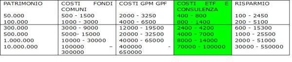 Questo significa che su un patrimonio di 100.000€, se affidato alle gestioni tradizionali, vengono prelevati dai 3500 ai 6500 euro l’anno; mentre se ci si affida ad un consulente si pagheranno circa 300-400 € per i costi di gestione degli Etf, qualche decina di euro per le commissioni di intermediazione dei medesimi e la parcella al professionista. In ogni caso sarà un bel risparmio!