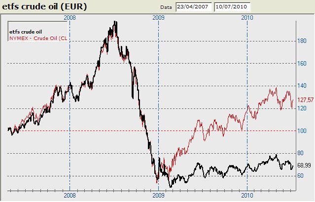 Da febbraio 2009, il petrolio saliva, arrivando ora a quotare il 106% in più,  e l’etfs crude oil scendeva di un paio di punti, come si vede dal grafico.