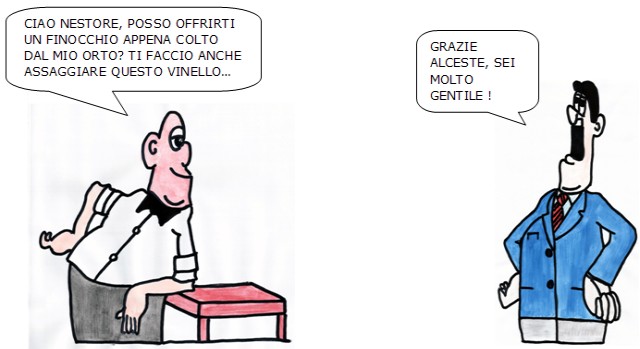 Vi pare possibile che Nestore si lasci ancora convincere da Alceste? Bisogna tenere presente che l’avventore non ha nessuna cultura enogastronomia e dedica poco tempo alle libagioni e ad informarsi adeguatamente, però come tutti mangia e beve. Si affida al suo gusto e ai consigli di chi reputa un esperto, in questo caso l’oste. Questi sa molto bene che il suo avventore non ha le capacità di capire che cosa stia assaggiando (e pagando) e quindi può permettersi di consigliare questo e quello, aggirando abilmente l’ostacolo se Nestore gli fa notare qualche cosa che non va. Alceste, lo si deve riconoscere, è molto bravo nel suo lavoro e tiene molto a mantenere la sua clientela affezionata.