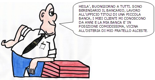 Cari lettori di “Osti e vini”, bentrovati e buon anno! Riprendiamo la nostra rassegna con i nostri amici Nestore, Alceste, Ulrico e facciamo la conoscenza di un nuovo personaggio, di cui vi avevo anticipato qualcosa nell’ultimo numero. Conosceremo infatti Berengario, di professione bancario. Noterete la somiglianza con l’oste Alceste del quale, di fatto, è il fratello gemello.