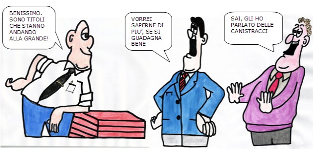 Oltre a ciò, ci sarebbe da chiedersi perchè le ‘Canistracci Oil’ vengono proposte da Berengario ai suoi clienti. Non abbiamo forse già visto Alceste fare la stessa cosa con il vino che ha in cantina? Forse anche le ‘Canistracci’ stanno nella ‘cantina’ di Berengario da tempo e vorrebbe venderle; oppure gli rendono più (in commissioni) di altri prodotti; oppure sono in scadenza, cioè a rischio insolvenza e vuole disfarsene al più presto.