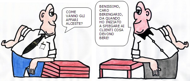Insomma, la situazione non è molto diversa da quella dell’osteria di Alceste. Anche Berengario fa il suo lavoro: vende ciò che gli rende di più, intrattiene e rassicura i clienti.