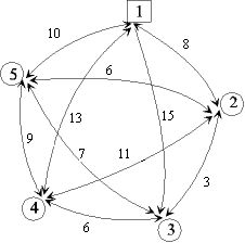 Il viaggiatore deve visitare quattro clienti, rappresentati dai nodi 2, 3, 4 e 5 partendo dalla propria abitazione, che corrisponde al nodo 1, per poi tornarsene a casa.