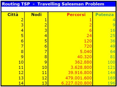La colonna in rosso mostra il numero dei percorsi calcolato con la formula del fattoriale dei nodi, mentre la colonna in verde è il risultato del numero delle città elevato alla potenza.